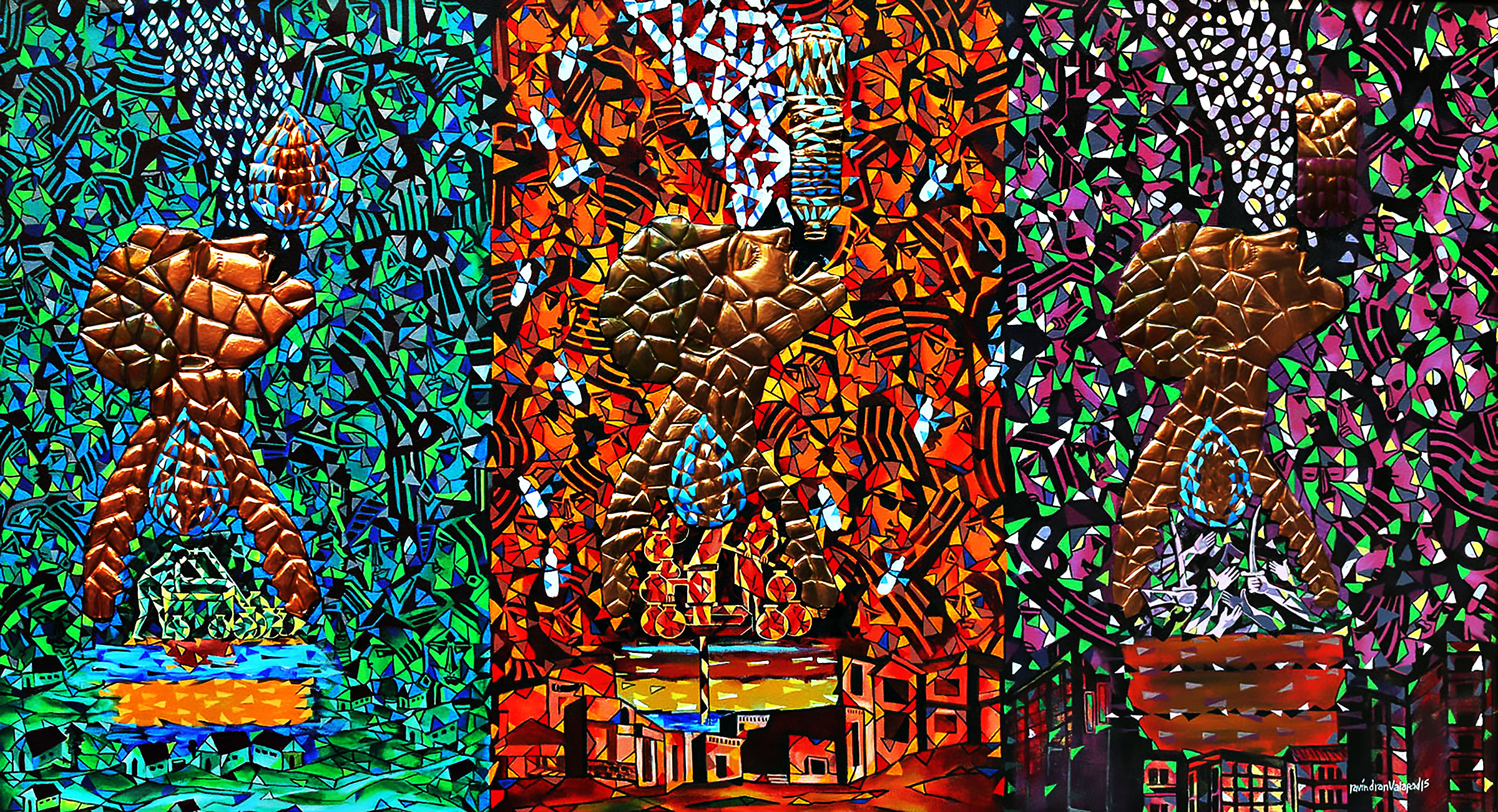 All the canvas Raveendran Vala pad painted and embossed with copper forms create an apparent kinetic effect because of the intricate cubic segments of figures arranged across the whole pictorial surface in different hues. The primary, secondary and complimentary colours create squares, triangles, cubes and straight lines of very small size to make the shapes suitable for the pictorial narratives. Even within the total narrative space of the picture the artist creates smaller portions of micro narration as in the case of his work titled “New Generation” where each segment is packed with various micro aspects of human life from birth to death. “Water Water Everywhere …. another work has three parts showing the evolution of the decay of nature and frightening scarcity of the water in the near future where every one is afraid of the inevitable dreadful war for the possession of water sources. “Natural Consequences” is a work that depicts the slow change from green nature to its burned down conditions. “Hands of innocence” is the present reality of terrorism faced by the world and “Eyes of Desert” captures the atmosphere of a culture. “Last supper” has figures with different expressions embossed on copper sheets.