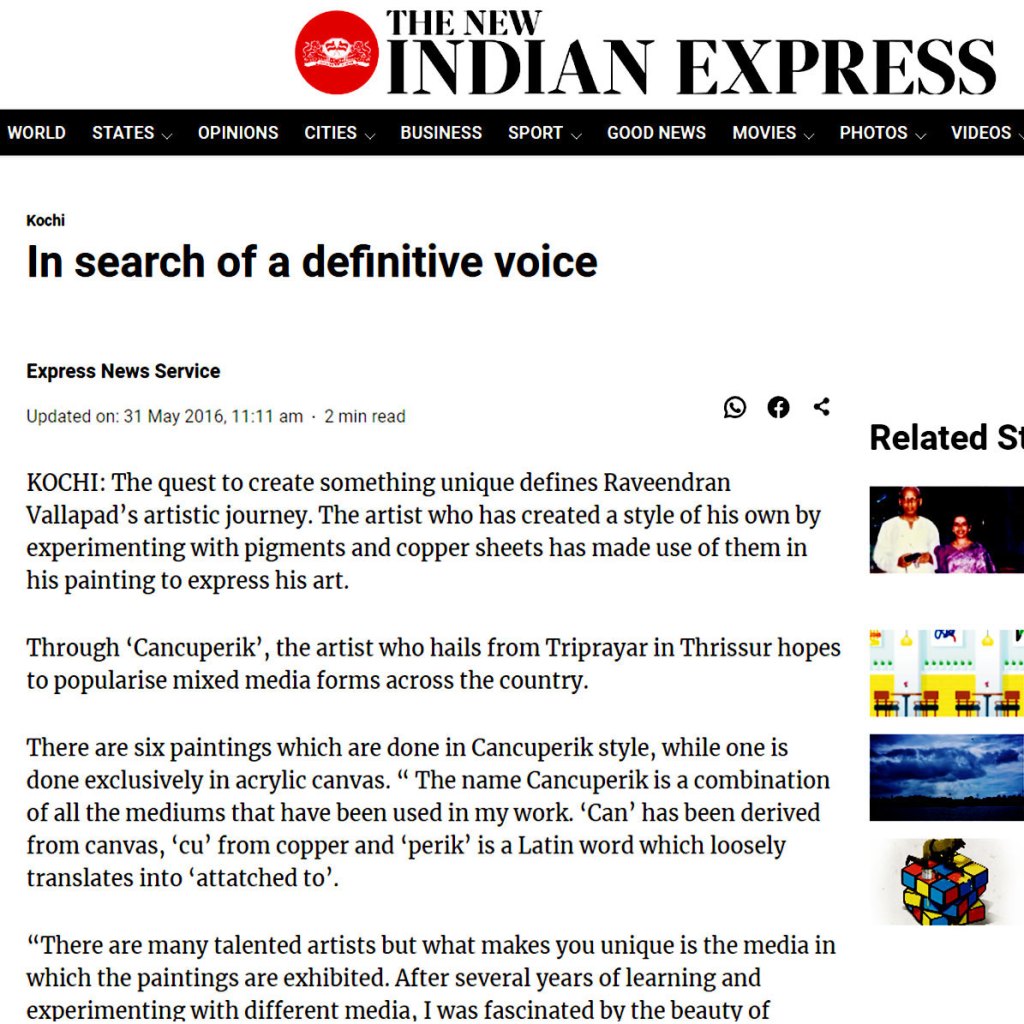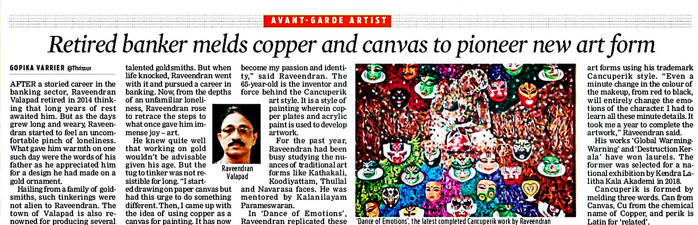 Raveendran Valapad, once a very active theatre artist now does experiments on canvas with pigments and copper sheets to create a new sensibility of crafting an art to show his technique in expressing various themes. He coined the term “CANCUPERIK” for his technique which could be decoded according to him as canvas (can) cupric for copper. Cutting the copper sheet of a specific gauge and making form on it by meticulously rubbing and pressing physically with specially made tools Raveendran Valapad showcases his mastery over the technique he has innovated. The shaped and articulated copper forms are heated up to different temperatures scientifically to get the copper “discoloured” to the expected colours and tones. With utmost care the copper forms are fixed on the canvas which is painted extensively in acrylic to create a sense of fullness. The two dimensional pictorial plane of the canvas painted in acrylic pigments gets a low relief effect because of the embossed copper forms.