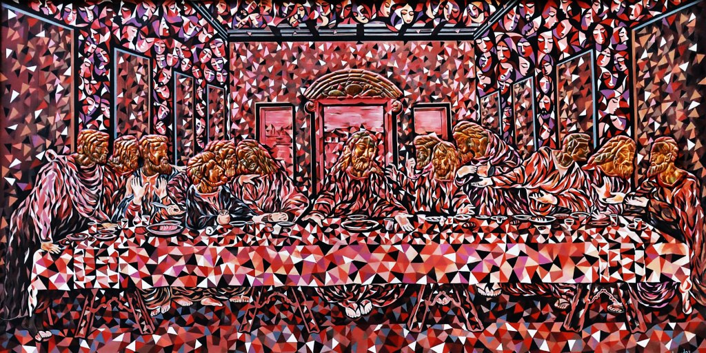 In the realm of Indian art, few have dared to reinterpret a masterpiece from the Western canon as boldly as Raveendran Valpad. His rendition of Leonardo da Vinci’s The Last Supper, one of the most famous works of Renaissance art, moves beyond the bounds of reality and enters the realm of abstraction, where geometry meets spirituality. In Raveendran’s Last Supper, the familiar scene of Christ and his disciples gathered before the crucifixion is in the artist’s unique application of the Cancuperik style, rooted in sacred geometry and mystical traditions.