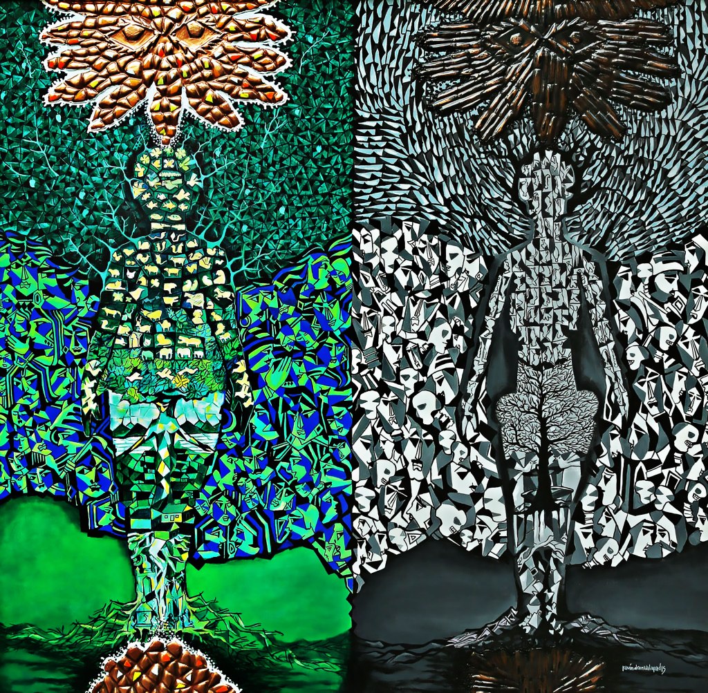 In the realm of Indian art, few have dared to reinterpret a masterpiece from the Western canon as boldly as Ravindran Valpad. His rendition of Leonardo da Vinci’s The Last Supper, one of the most famous works of Renaissance art, moves beyond the bounds of reality and enters the realm of abstraction, where geometry meets spirituality. In Rabindra’s Last Supper, the familiar scene of Christ and his disciples gathered before the crucifixion is in the artist’s unique application of the Cancuperik style, rooted in sacred geometry and mystical traditions.