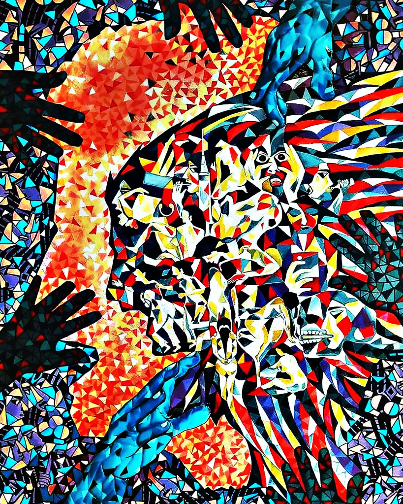 In Survival of the Brutest, Raveendran Valpad uses acrylics to create a profound and vivid commentary on the degradation of humanity in modern society. This work goes beyond mere visuality and strikes at the moral core of our collective consciousness. At first glance, it captivates with its chaotic yet harmonious interplay of bold strokes, vivid shades, and shadowy figures, revealing a raw and unflinching portrayal of social decay.